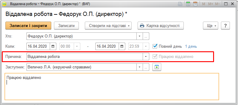 Програма сама встановить прапор «Працюю віддалено» і відключить попередження про відсутність для тих, хто буде писати або ставити задачі цьому співробітнику. Причому ознака «Працюю віддалено» не заважає створенню відсутностей по іншими причинами, наприклад, «Лікарняний» або «Місцеве відрядження».