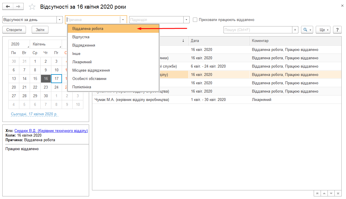 Щоб швидко дізнатися, хто сьогодні працює вдома, в списку відсутностей досить встановити відбір «Причина - Віддалена робота».