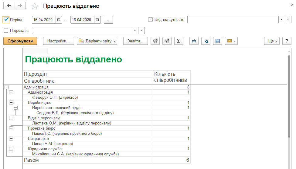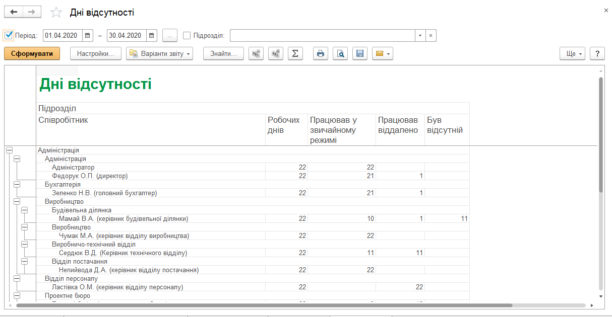 Для більш детального аналізу є звіти «Працюють віддалено» і «Дні відсутності» - хто скільки днів працював в звичайному режимі / працював віддалено / відсутній.