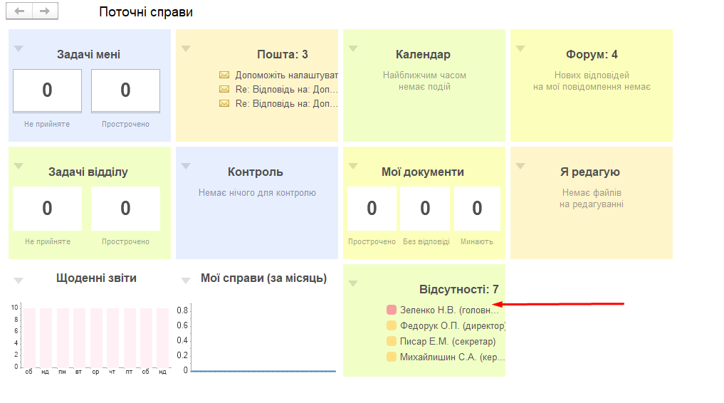 На робочому столі «Поточні справи» є віджет «Відсутності». На ньому відображаються відсутні сьогодні співробітники з різним маркуванням причин - дистанційна робота, лікарняний і т. Д. Клік на віджет відкриває загальний список відсутностей з усіма встановленими раніше відборами.