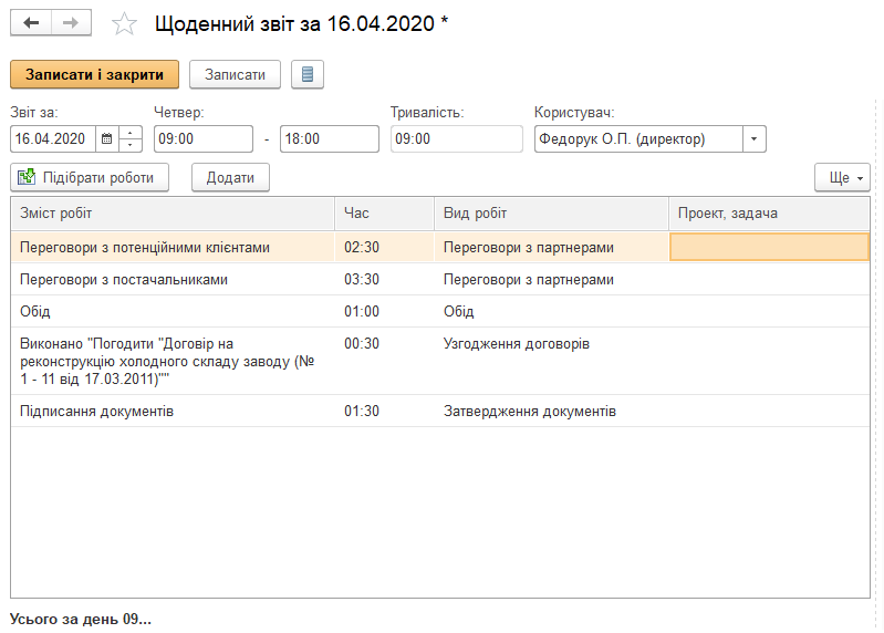 Записи в щоденний звіт вносяться як вручну, так і автоматично при включенні хронометражу (наприклад, по документу або по задачі).
