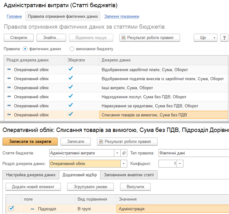 Правила визначення фактичних даних гнучкі: можна накладати будь-які відбори, і навпаки, акумулювати по одній статті бюджету суму показників за декількома статтями балансу (доходів та витрат).