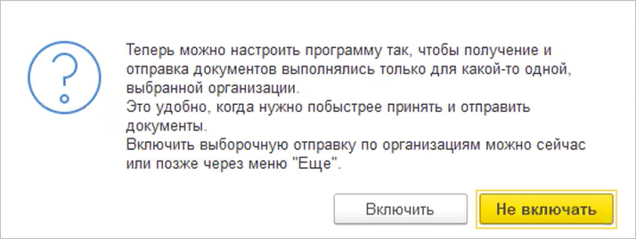 ● Реализована возможность отправки и получения электронных документов с отбором по организации. При первой отправке/получении документов после обновления появится окно с выбором данной возможности, если пользователю доступно несколько сертификатов для учетных записей организаций. В дальнейшем можно будет включить/отключить опцию в подменю «Ещё».