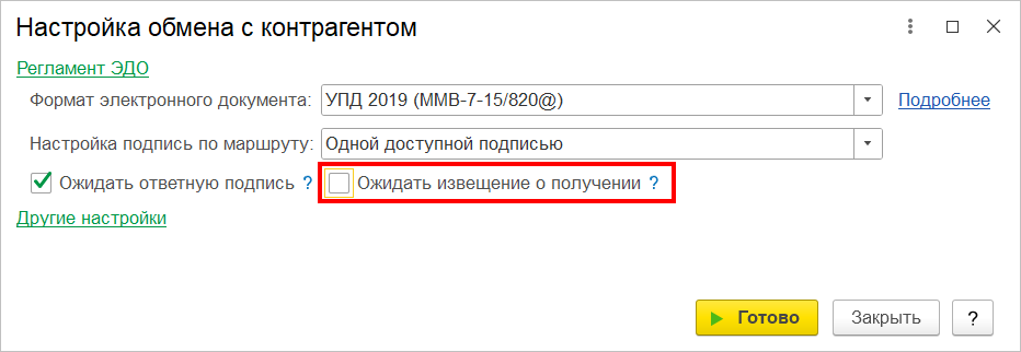 ● Теперь обмен исходящими электронными документами через оператора ЭДО по умолчанию будет завершаться без ожидания ответного «Извещения о получении». В ответ на входящие электронные документы ИОП будет отправляться, как и раньше. При необходимости включить ожидание ИОП можно в настройках обмена с контрагентом.