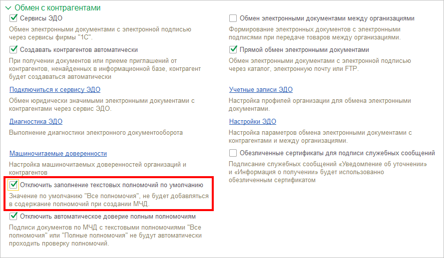 ● Реализована возможность отключить автоматическое заполнение полномочий значением “Все полномочия” при создании МЧД. Опцию можно найти в меню Администрирование - Обмен электронными документами - Обмен с контрагентами - Отключить заполнение текстовых полномочий по умолчанию.