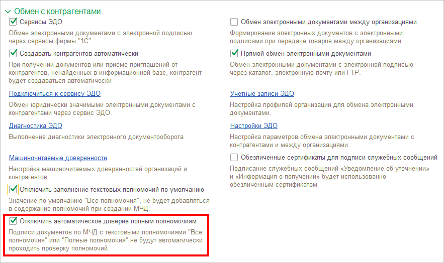 ● Реализована возможность отключить автоматическое прохождение проверки полномочий для подписей документов по МЧД с текстовыми полномочиями “Все полномочия” или “Полные полномочия”. Опцию можно найти в меню Администрирование - Обмен электронными документами - Обмен с контрагентами - Отключить автоматическое доверие полным полномочиям.