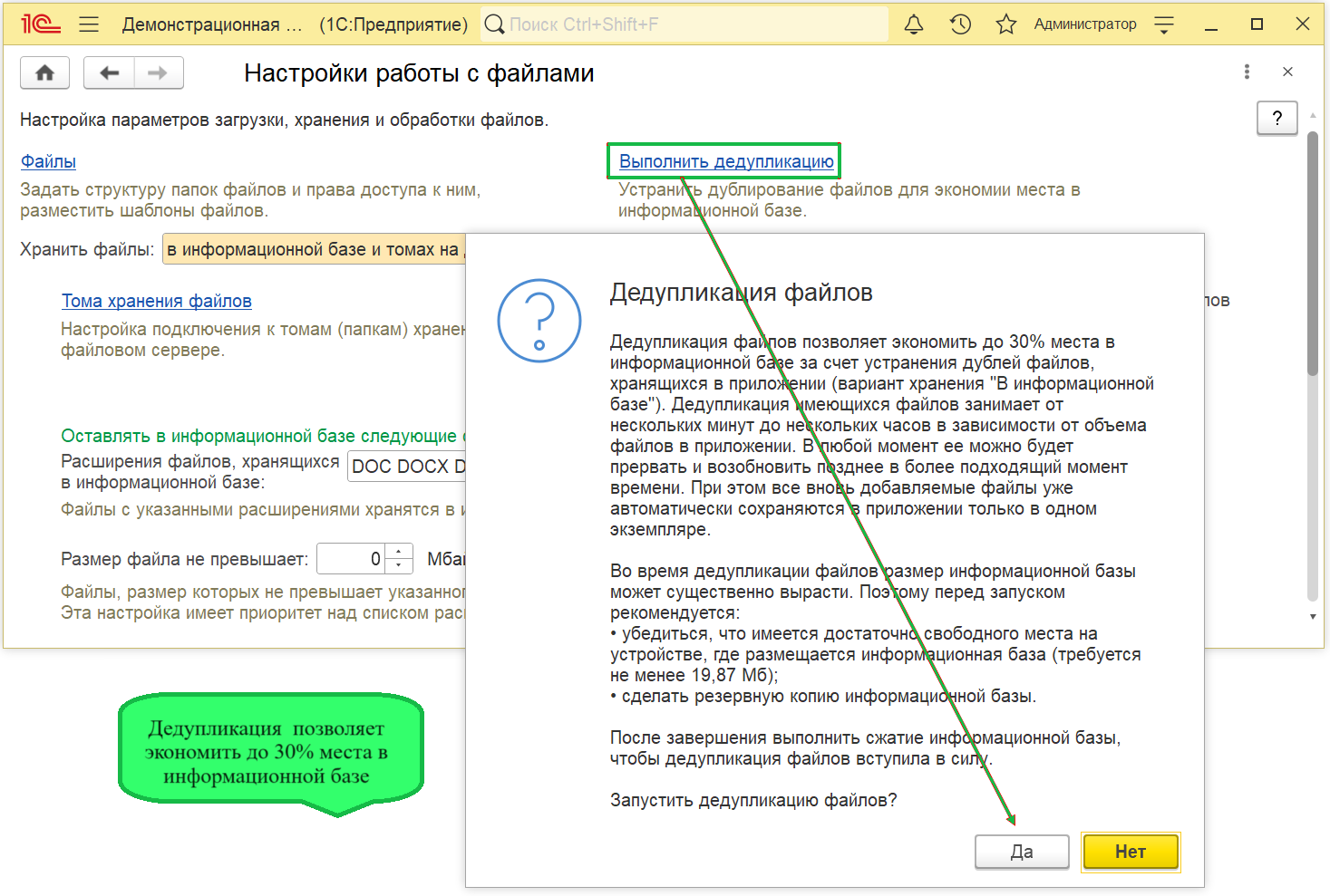 Предусмотрена возможность программного отключения механизма файлового архива в тех случаях, когда его использование в конфигурации не требуется. Для этого в параметр Настройки процедуры ПриОпределенииНастроек общего модуля РаботаСФайламиПереопределяемый добавлено свойство ДоступенФайловыйАрхив. Для отключения необходимо переопределить это свойство, установив его значение в Ложь.