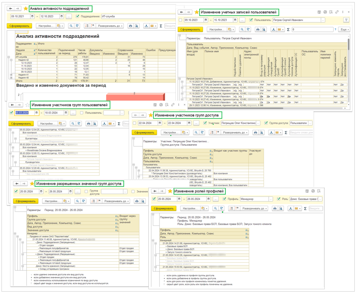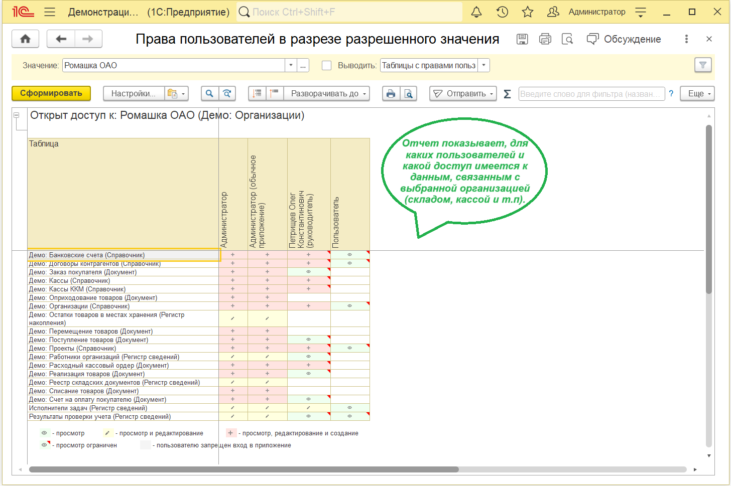 Теперь отчет Анализ прав доступа дополнительно выводит информацию о доступных неинтерактивных правах Чтение, Изменение и Добавление, с помощью которых можно получить доступ к данным неявным образом: программно с помощью расширений, внешних отчетов и обработок, через консоль запросов и т.п. Эти уточнения выводятся в тех случаях, когда в ролях выключены соответствующие интерактивные права Просмотр, Редактирование и Интерактивное добавление. К отчету можно перейти из раздела Администрирование - Отчеты администратора.