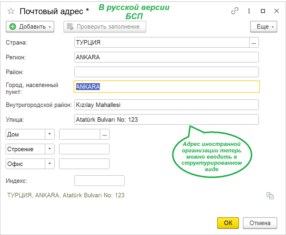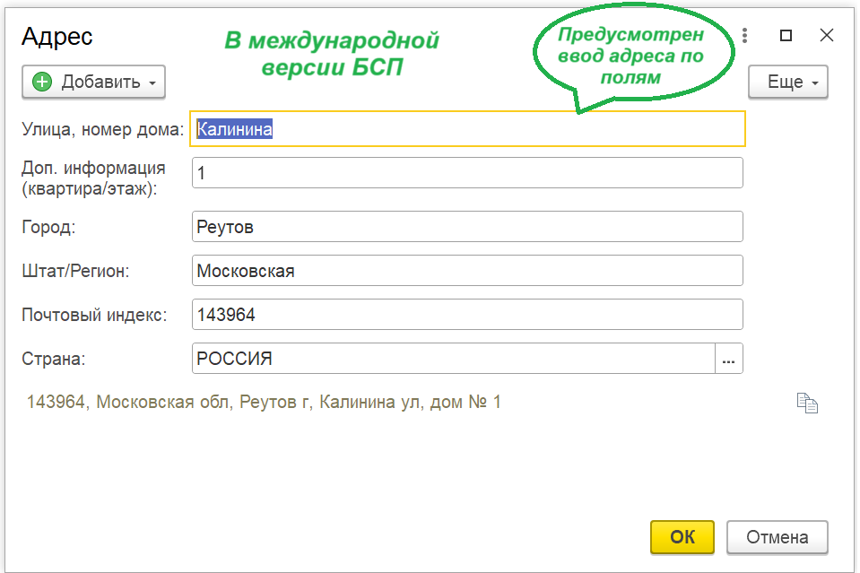 КонецЕслиРаботаСАдресами возвращаемое значение функций СведенияОбАдресе, СведенияОбАдресах.СведенияОбАдресеПриказМинфинаРФ171н дополнено полем ИдентификаторПомещения, которое содержит уникальный идентификатор адресного объекта для квартиры, офиса или иного помещения.?РаботаСАдресамиКлиентСервер предусмотрена функция-конструктор ПоляПомещения. УправлениеПечатьюПереопределяемый.ПриЗаполненииСпискаОбщихПолей. Пример см. в процедуре ПриЗаполненииСпискаОбщихПолей общего модуля УправлениеПечатьюПереопределяемый.Для переопределения собственной логики работы с файлами, размещенными в файловом архиве (например, для проверки их доступности и открытия пользовательской формы оформления заявки администратору при недоступности файла), добавлена переопределяемая процедура ПриВыполненииДействияСФайлом общего модуля РаботаСФайламиКлиентПереопределяемый.